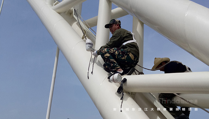 在安康的城東漢江大橋中,橋梁的照明工程施工已經進行到高空作業部分,現在現場在用吊車配合作業進行LED燈具的安裝工作。