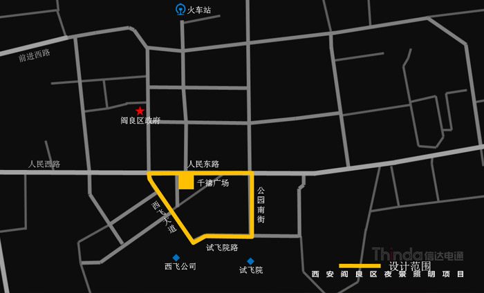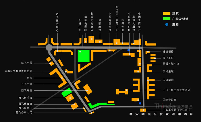 閻良區(qū)位于西安東北部,不但是一座底蘊(yùn)深厚的歷史古城,還是一座資源豐富的航空名城,區(qū)內(nèi)有中航工業(yè)試飛中心、第一飛機(jī)設(shè)計研究院、西飛公司、中國飛機(jī)強(qiáng)度研究所等大型航空企事業(yè)單位,聚集了1/3以上的航空資源。閻良已成為中國唯一、亞洲最大的六位一體的航空工業(yè)基地,被譽(yù)為“中國航空城”。本案亮化設(shè)計范圍為閻良區(qū)人民東路、西飛大道、試飛院路、公園南街等四條道路兩側(cè)的30余棟建筑及廣場、景觀帶。