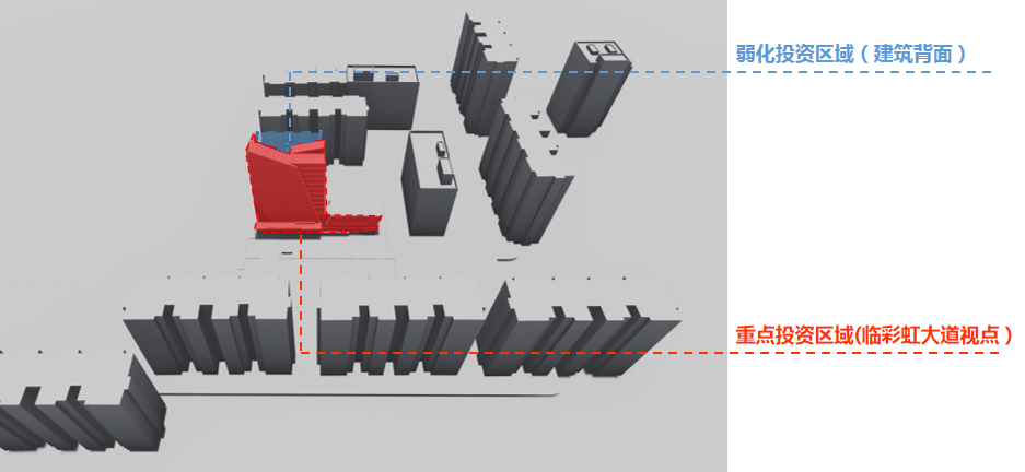 信達電通將彩虹大道視點立面作為重點亮化和設計區域,興賢路和東虹路視點立面進行輔助照明設計。