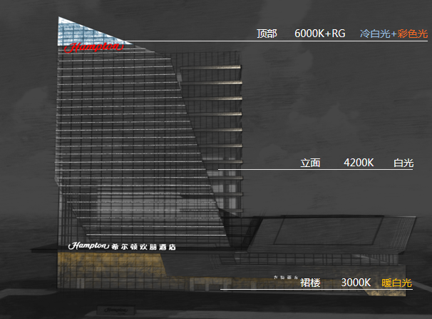 整座酒店形成照明層次,在建筑頂部區域營造天際線,光色上選用6000K冷白光和彩色光。建筑中間區域立面作為過渡段,起著承上啟下的作用,選用4200K的白光。建筑裙樓部分作為底部基座,光色選用3000k的暖白光,給游客帶來舒適的視覺體驗。