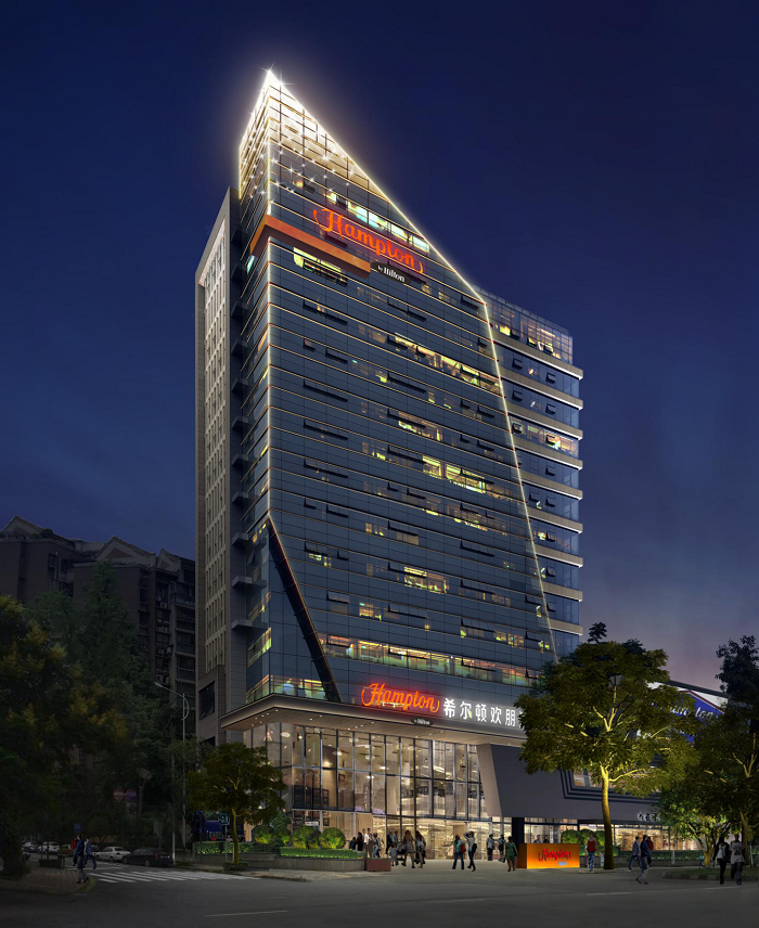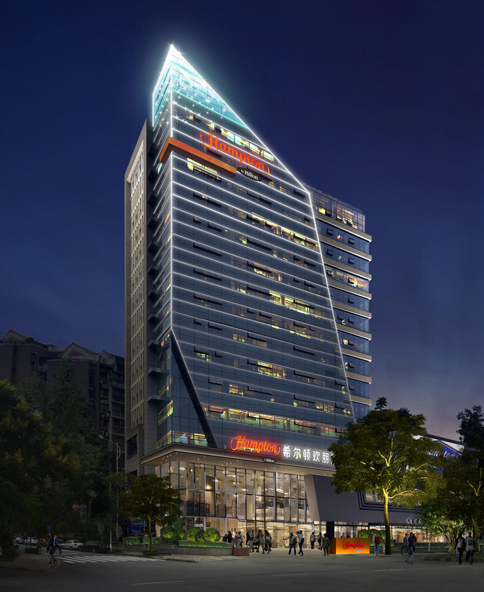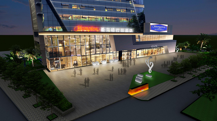 都江堰希爾頓歡朋酒店是一座以希爾頓為主題品牌的高端酒店,信達電通對其進行整體夜景照明設計。