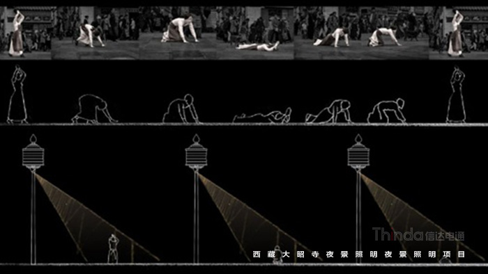 3)重大節(jié)日模式下所有照明燈具全開,重要節(jié)點(diǎn)投影經(jīng)文開啟,使大昭寺成為一個巨大的轉(zhuǎn)經(jīng)筒與朝拜的人一起緩緩轉(zhuǎn)動。