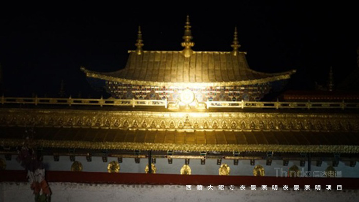 大昭寺是四層樓的碉堡式建筑結(jié)構(gòu),各殿宇樓頂形狀高低不一,為全面營造金頂?shù)囊归g氛圍,信達(dá)科技采用投光燈投射金頂?shù)脑O(shè)計(jì)方案。投光燈分布在圍繞大昭寺的十個點(diǎn)位上,根據(jù)被照物高度、角度設(shè)置燈具數(shù)量、高度、角度、方向,以實(shí)現(xiàn)金頂?shù)恼w亮度統(tǒng)一。