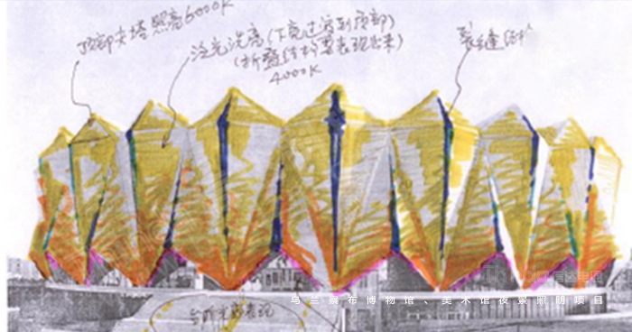 烏蘭察布市博物館屬于主題文化型公共照明,因此要以主題性為主,照明設計需要針對區(qū)域內的照明載體(主題建筑、公共設施、等)進行烘托式的室外亮化照明,特別是主題建筑載體的燈光設計,在設計的時候詳細分析載體的結構與內涵,虛實結合,從而強化文化主題,營造文化藝術氛圍。